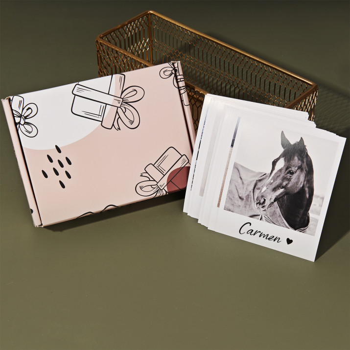 Ihre Bilder werden digital auf hochwertigem 300 g/m2 Papier gedruckt. Der Druck im Polaroid-Stil sieht wunderschön aus, die Farben sind gesättigt und der Effekt ist lang anhaltend. Wir können die von Ihnen gewünschten Bildunterschriften auf den 9 x 9 cm großen Fotos anbringen. Wir verpacken Ihre Fotosammlung in einer speziellen 12 x 10 cm großen Geschenkbox.Das Set ist in vier Varianten erhältlich: