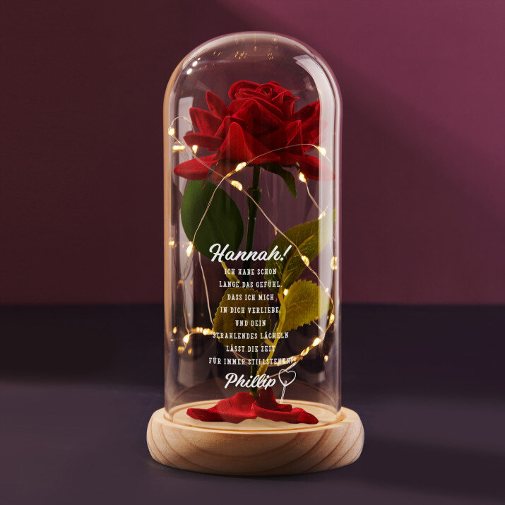 Außerdem schaffen die LED-Leuchten im Inneren eine romantische Atmosphäre. Die Oberfläche der Glaskuppel kann zusätzlich mit Initialen, Namen oder einer kurzen Nachricht Ihrer Wahl eingraviert werden, was das Geschenk noch spezieller macht. Die ewige Rose wird in einer Geschenkbox geliefert.
