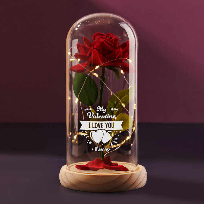 Außerdem schaffen die LED-Leuchten im Inneren eine romantische Atmosphäre. Die Oberfläche der Glaskuppel kann zusätzlich mit Initialen, Namen oder einer kurzen Nachricht Ihrer Wahl eingraviert werden, was das Geschenk noch spezieller macht. Die ewige Rose wird in einer Geschenkbox geliefert.