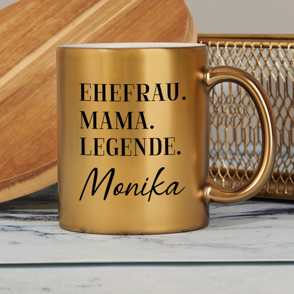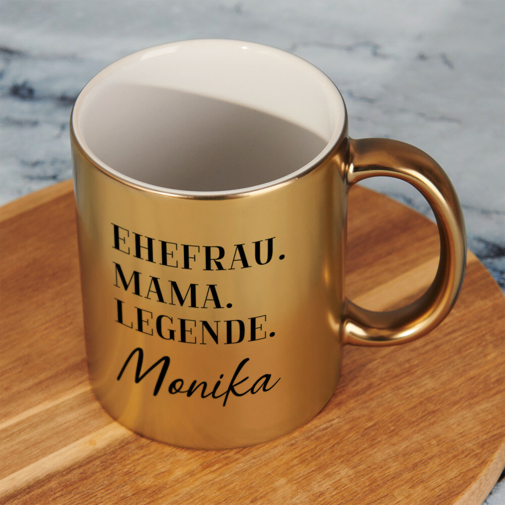 Ein wunderschönes Geschenk für jeden Anlass! Unser mit viel Liebe zum Detail gefertigte goldener Becher wird jeden Luxus-Fan begeistern. Sein einzigartiger Look wird durch ein satiniertes Metallic-Finish und einen außergewöhnlichen Aufdruck auf beiden Seiten erzielt. Zwar ist nicht alles Gold, was glänzt, aber unser Becher scheint nicht nur perfekt zu sein… Er ist perfekt! Für Ihren Morgenkaffee oder -tee natürlich :)