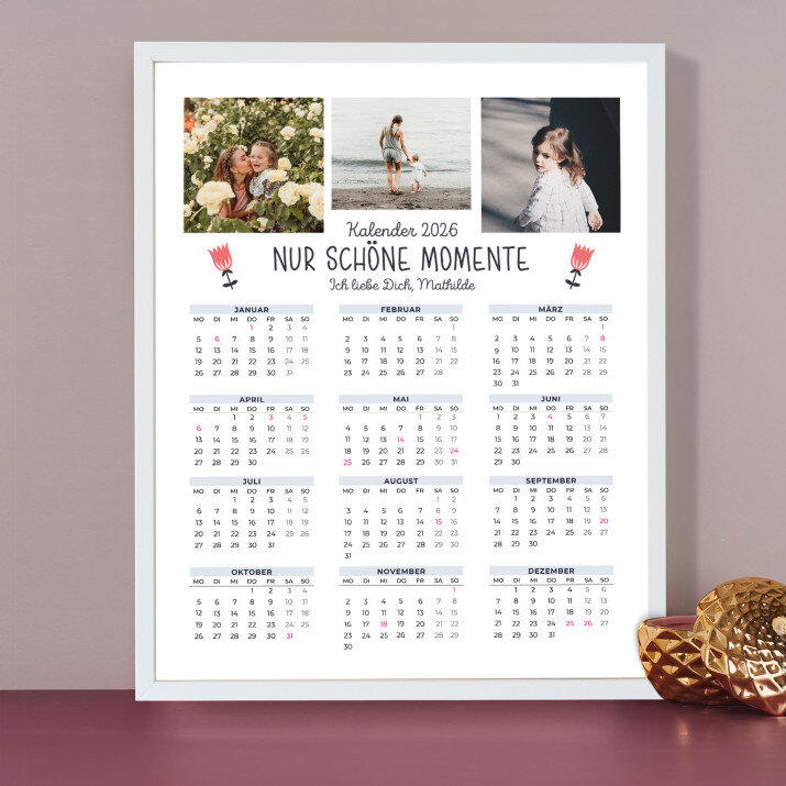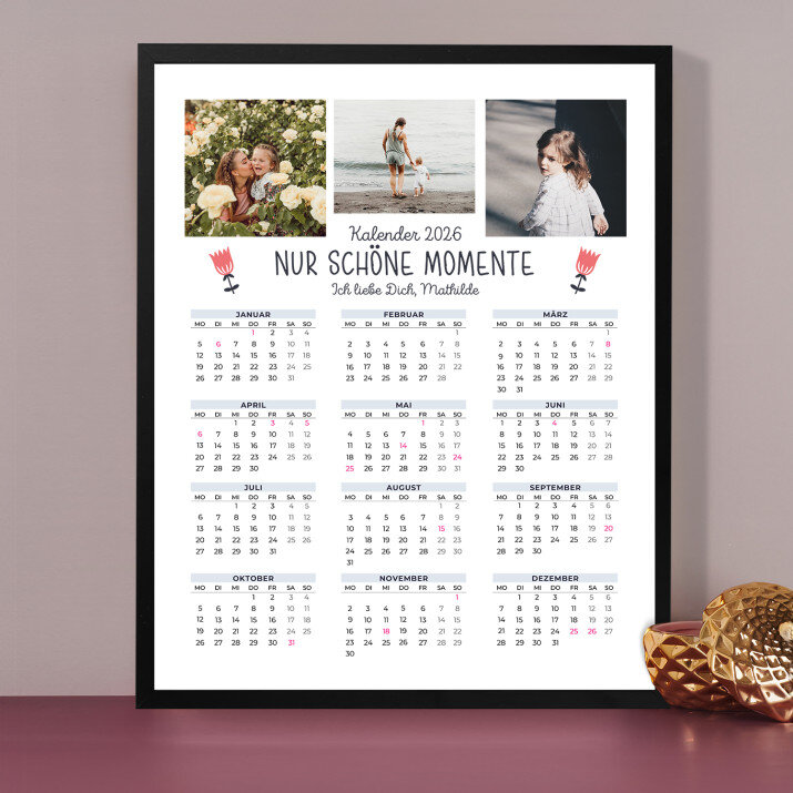 Ein personalisierter gerahmter Kalender ist eine tolle Geschenkidee, die zu jeder Einrichtung passt! Das ganze Jahr wurde auf einer Seite platziert, so dass die Anordnung der Monate gut ersichtlich ist. Der Druck auf Fotopapier sieht wunderschön aus, die Farben sind gesättigt und der Effekt ist lang anhaltend. Ein tolles Geschenk und Andenken in einem!Abmessungen: 40 x 50 cm