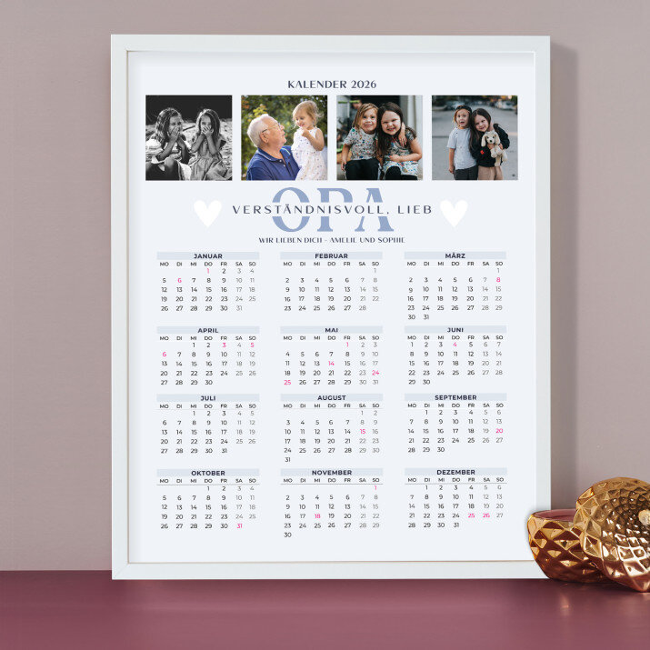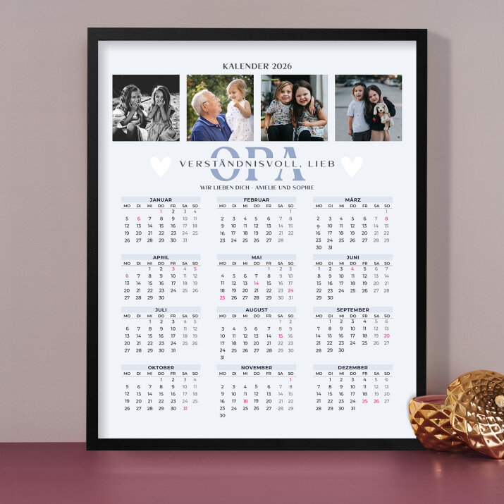 Ein personalisierter gerahmter Kalender ist eine tolle Geschenkidee, die zu jeder Einrichtung passt! Das ganze Jahr wurde auf einer Seite platziert, so dass die Anordnung der Monate gut ersichtlich ist. Der Druck auf Fotopapier sieht wunderschön aus, die Farben sind gesättigt und der Effekt ist lang anhaltend. Ein tolles Geschenk und Andenken in einem!Abmessungen: 40 x 50 cm