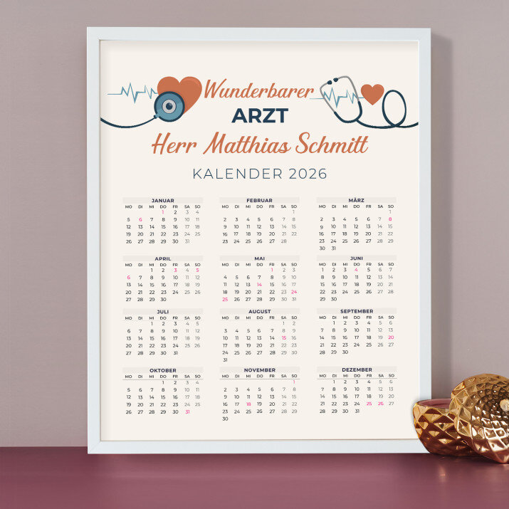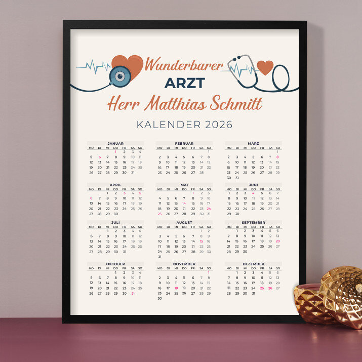 Ein personalisierter gerahmter Kalender ist eine tolle Geschenkidee, die zu jeder Einrichtung passt! Das ganze Jahr wurde auf einer Seite platziert, so dass die Anordnung der Monate gut ersichtlich ist. Der Druck auf Fotopapier sieht wunderschön aus, die Farben sind gesättigt und der Effekt ist lang anhaltend. Ein tolles Geschenk und Andenken in einem!Abmessungen: 40 x 50 cm