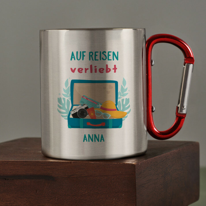 Glänzender Stahlbecher mit doppelten Wänden und buntem Aufdruck. Durch die hochqualitative Verarbeitung und elegante Ausführung eignet er sich perfekt für Reisen und Zuhause. Der Becher wird raue Bedingungen überleben und immer gut aussehen! Er hat ein schwarzes Metallhenkel, das auch ein Karabiner ist, mit dem Sie den Becher beispielsweise an einem Rucksack befestigen können.