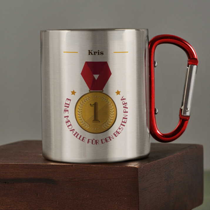 Glänzender Stahlbecher mit doppelten Wänden und buntem Aufdruck. Durch die hochqualitative Verarbeitung und elegante Ausführung eignet er sich perfekt für Reisen und Zuhause. Der Becher wird raue Bedingungen überleben und immer gut aussehen! Er hat ein schwarzes Metallhenkel, das auch ein Karabiner ist, mit dem Sie den Becher beispielsweise an einem Rucksack befestigen können.