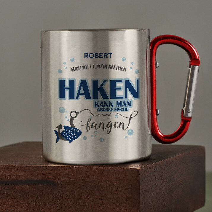 Glänzender Stahlbecher mit doppelten Wänden und buntem Aufdruck. Durch die hochqualitative Verarbeitung und elegante Ausführung eignet er sich perfekt für Reisen und Zuhause. Der Becher wird raue Bedingungen überleben und immer gut aussehen! Er hat ein schwarzes Metallhenkel, das auch ein Karabiner ist, mit dem Sie den Becher beispielsweise an einem Rucksack befestigen können.