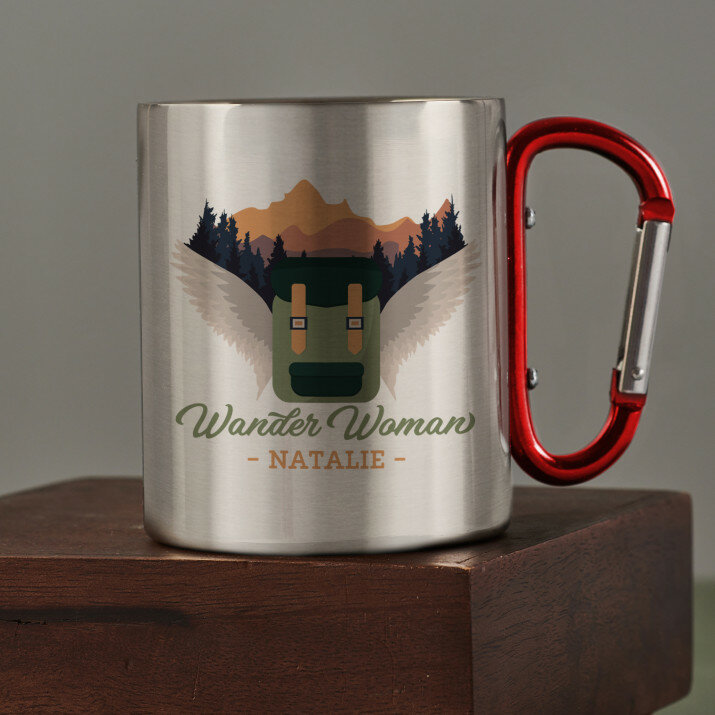 Glänzender Stahlbecher mit doppelten Wänden und buntem Aufdruck. Durch die hochqualitative Verarbeitung und elegante Ausführung eignet er sich perfekt für Reisen und Zuhause. Der Becher wird raue Bedingungen überleben und immer gut aussehen! Er hat ein schwarzes Metallhenkel, das auch ein Karabiner ist, mit dem Sie den Becher beispielsweise an einem Rucksack befestigen können.