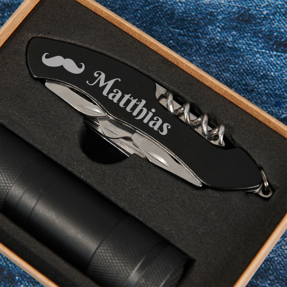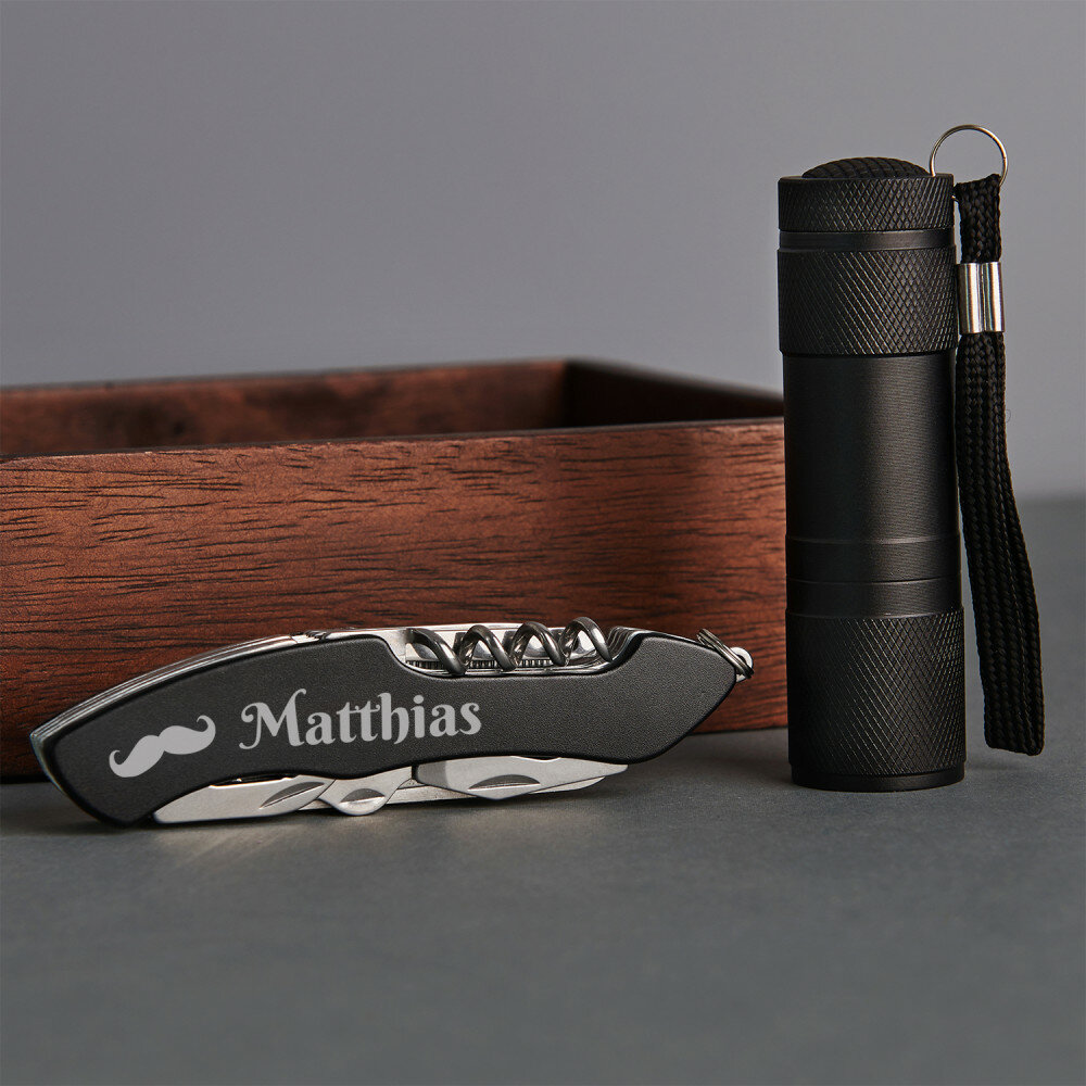 Das Set, bestehend aus einer Taschenlampe und einem Multifunktionsmesser, verpackt in einer Kraftbox, ist die perfekte Geschenkidee für jeden Technikbegeisterten. Unter den kompakten Werkzeugen finden Sie bis zu 11 Stahlwerkzeuge: Messer, Säge, Fischschaber, Schere, Flaschenöffner, Dosenöffner, Locher, Nagelfeile, Kreuzschlitzschraubenzieher, Korkenzieher und Meißel. Mit einem solchen Set sind Sie für einen Wochenendausflug außerhalb der Stadt bestens gerüstet! Die schwarze Farbgebung der Werkzeuge und die ästhetisch ansprechende Schachtel mit Schaumstofffüllung betonen das elegante Design des Geschenks perfekt. Zusätzlich bringen wir eine personalisierte Gravur auf dem Taschenmesser an, über die sich jeder Beschenkte sicher freuen wird!Abmessungen (B/H/T):