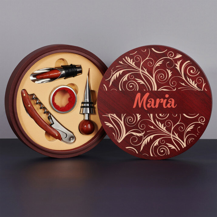 Wollen Sie jemanden begeistern? Schenken Sie ihm dieses einzigartige Weinset! Der Wunschname oder -text wird von einem schönen Blumenmuster eingerahmt.