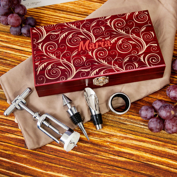 Ein schönes vierteiliges Weinset in einer eleganten Schachtel mit Aufdruck auf dem Deckel.
