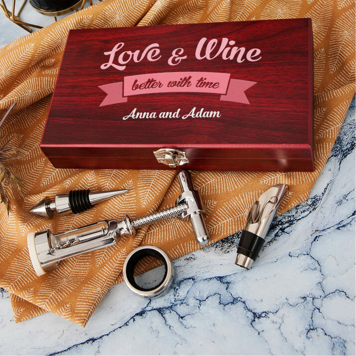 Ein schönes vierteiliges Weinset in einer eleganten Schachtel mit Aufdruck auf dem Deckel.