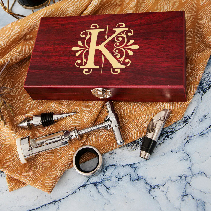 Ein schönes vierteiliges Weinset in einer eleganten Schachtel mit Aufdruck auf dem Deckel.