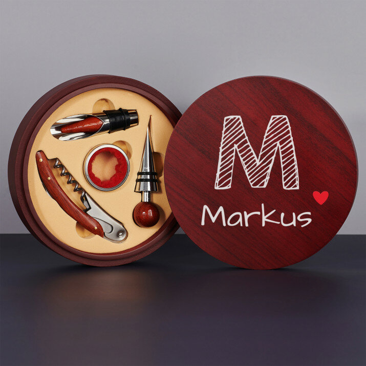 Ein schönes vierteiliges Weinset in einer eleganten Schachtel mit Aufdruck auf dem Deckel.