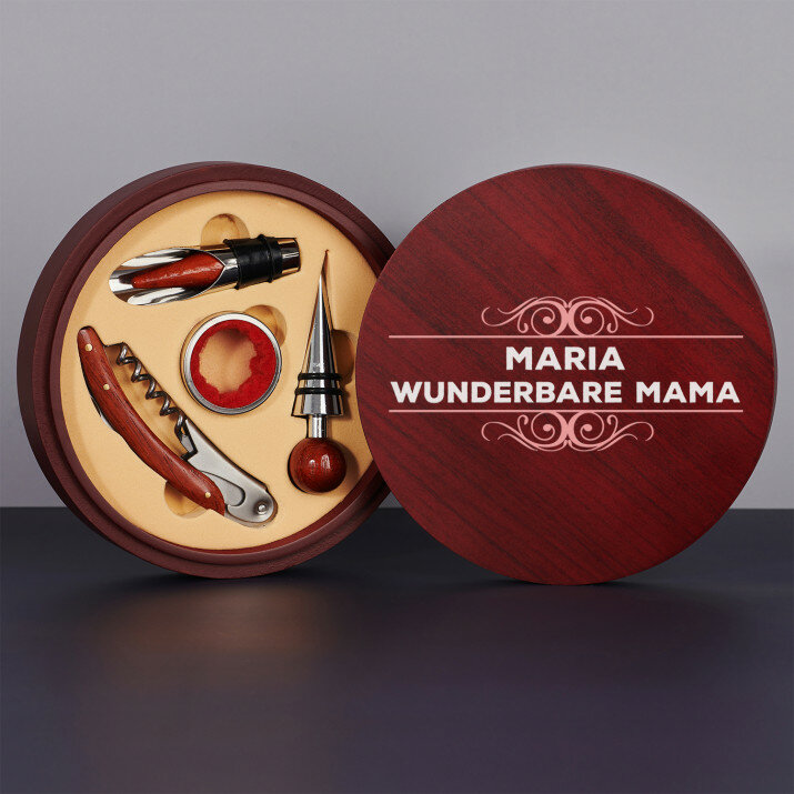 Ein schönes vierteiliges Weinset in einer eleganten Schachtel mit Aufdruck auf dem Deckel.