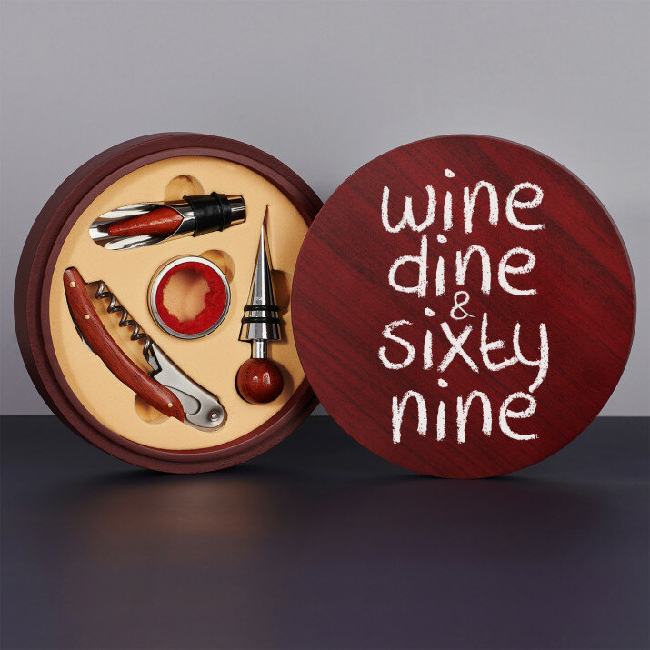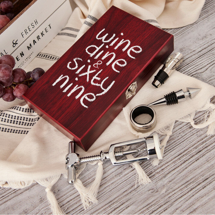 Ein schönes vierteiliges Weinset in einer eleganten Schachtel mit Aufdruck auf dem Deckel.