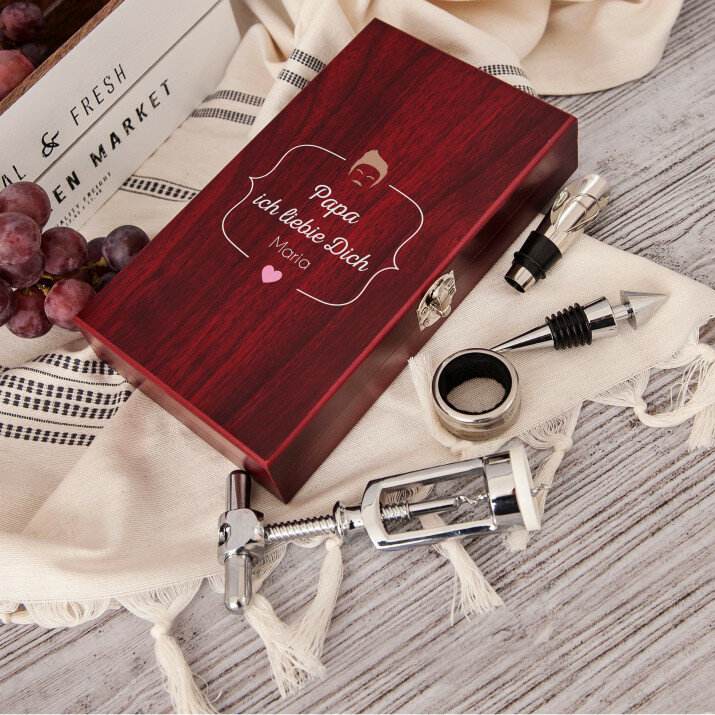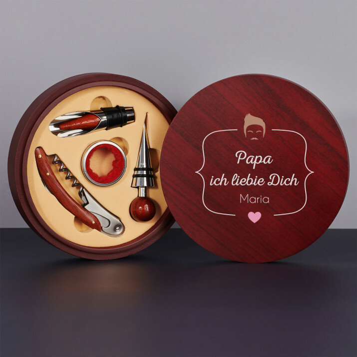 Bewegen Sie Ihren Vater mit diesem fantastischen Geschenk, das Sie ihm zum Geburts- oder Vatertag machen können! Eine warme Erklärung von der Tochter oder dem Sohn, die auf dem Weinset eingraviert ist, liefert dem Geschenk einen besonderen Charakter.