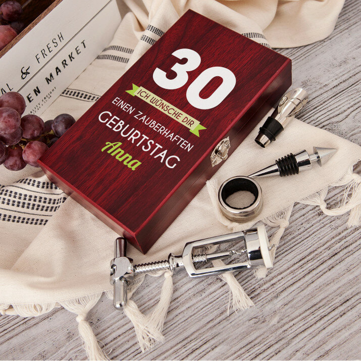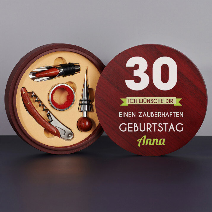 Geschenk zum 30. Geburtstag. Wenn die Frau ein Weinset mit den zauberhaften Geburtstagswünschen erhält, wird sie dieses auf den Ehrenplatz stellen, damit alle es bewundern können. Wenn der Mann dieses Geschenk erhält, wird er es sofort überprüfen! Schenken Sie dieses vielseitige Geschenk der geliebten Person, damit sie schon jetzt es benutzen und den anderen zeigen kann!