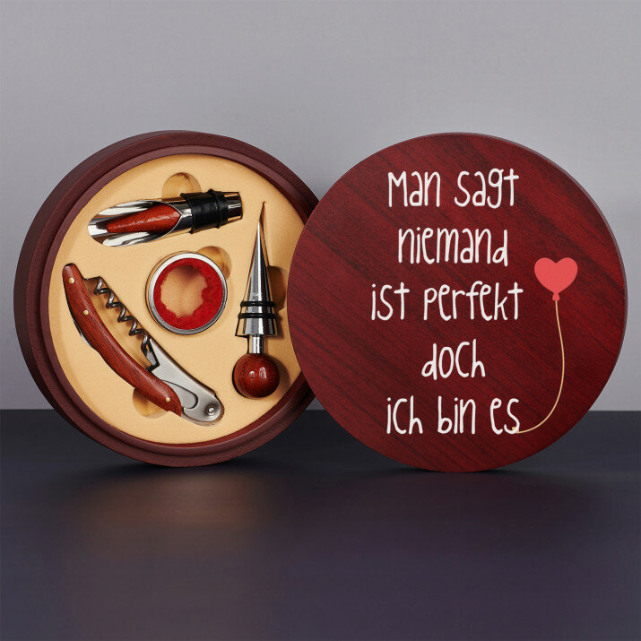 Ein schönes vierteiliges Weinset in einer eleganten Schachtel mit Aufdruck auf dem Deckel.