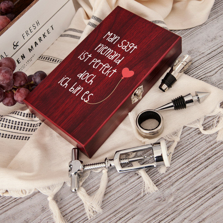 Ein spannendes und humorvolles Liebesgeschenk! Schenken Sie dieses Weinset Ihrer geliebten Person - dieses Geschenk wird bestimmt ein Lächeln auf ihrem Gesicht hervorrufen. Immer wenn sie auf dieses Weinset schauen wird, wird sie an den perfekten Schenkenden denken!