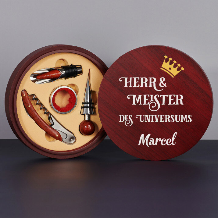 Ein schönes vierteiliges Weinset in einer eleganten Schachtel mit Aufdruck auf dem Deckel.