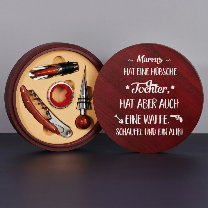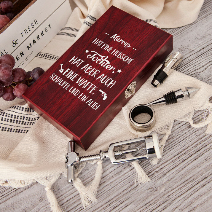 Ein schönes vierteiliges Weinset in einer eleganten Schachtel mit Aufdruck auf dem Deckel.