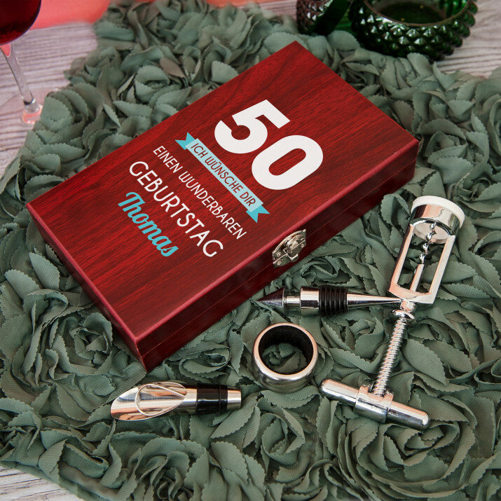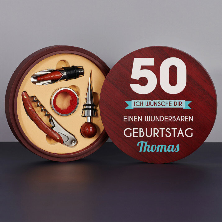 Geschenk zum 50. Geburtstag. Wenn Ihre geliebte Person den Liebhaber des Weines ist, schenken Sie ihm dieses einzigartige Weinset. Schon jetzt Mr Right konnte vor der ganzen Familie mit dem erstaunlichen Geschenk prahlen, welches er von Ihnen gerade erhalten hat!