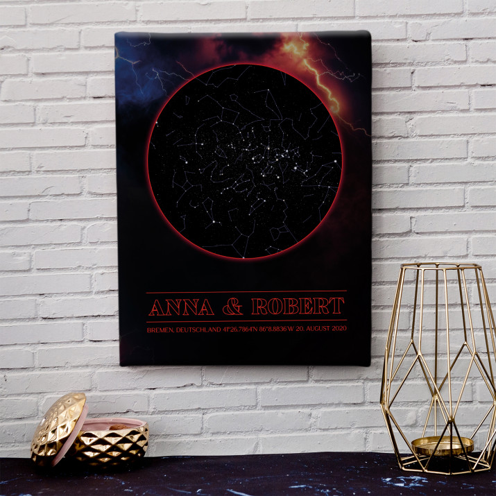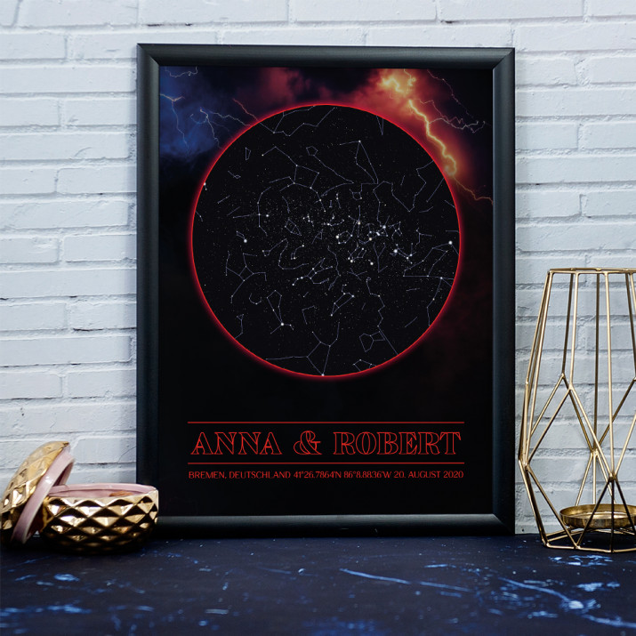 Ein einzigartiges Poster in einem Rahmen oder ein Leinwandbild ist ein schönes und originelles Andenken an einem wichtigen Moment für Sie. Durch Eingabe der Stadt und des Datums Ihrer Wahl können Sie das Erscheinungsbild des Himmels und das Sternmuster an diesem Tag wiederherstellen. Die Personalisierung umfasst auch die von Ihnen angegebenen Namen, eine Widmung und andere Elemente, die einen solchen Ausdruck zu einem sehr persönlichen und einzigartigen Geschenk machen.Personalisierung