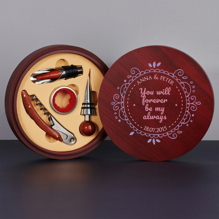 Schenken Sie dieses einzigartige Weinset mit einer Liebeserklärung für immer und den eingravierten Namen und dem wichtigen Datum zu Ihrem Jahres- oder Hochzeitstag!