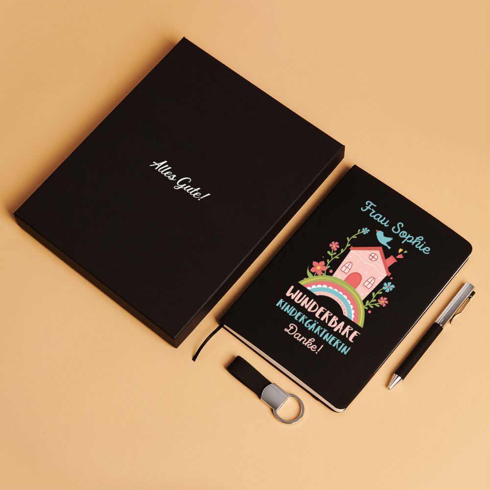 Set mit elegantem Notizbuch mit ausgewählter Personalisierung.