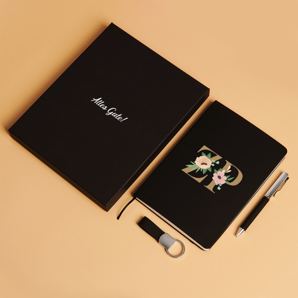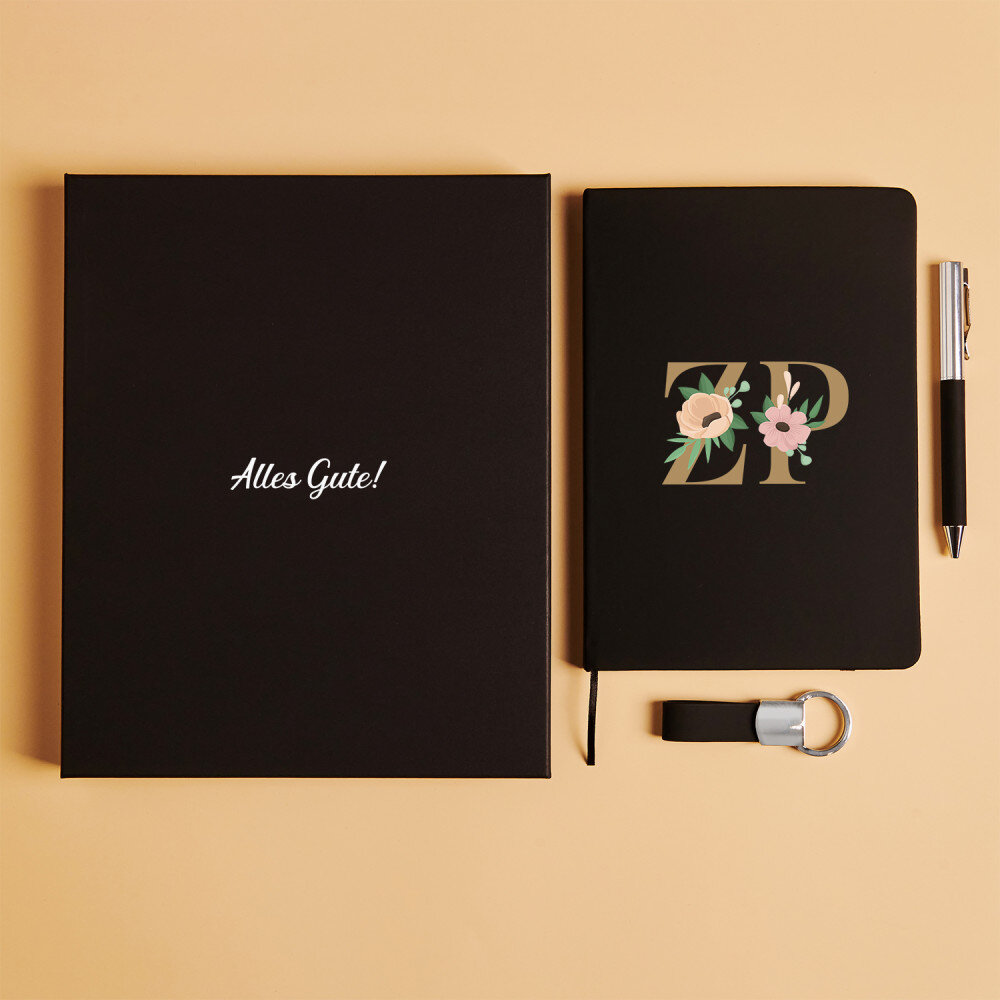 Set mit elegantem Notizbuch mit ausgewählter Personalisierung.