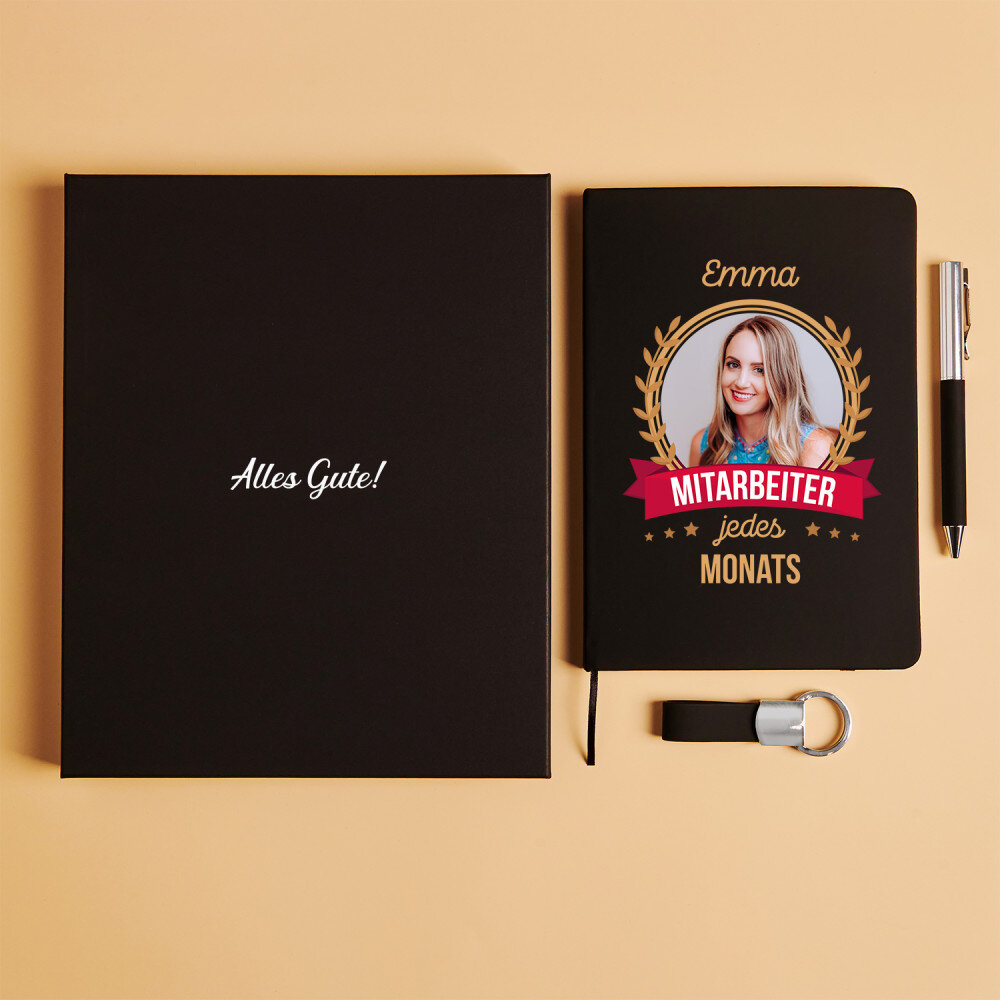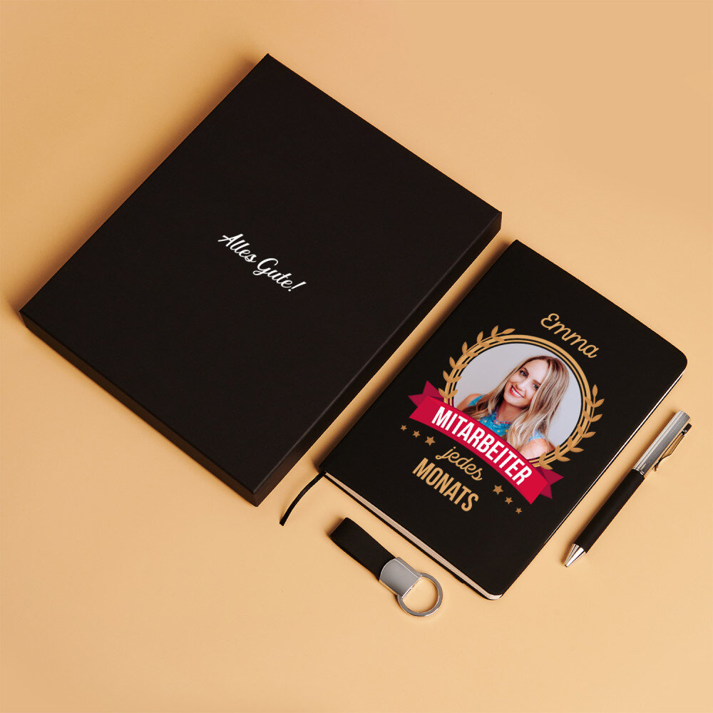 Set mit elegantem Notizbuch mit ausgewählter Personalisierung.