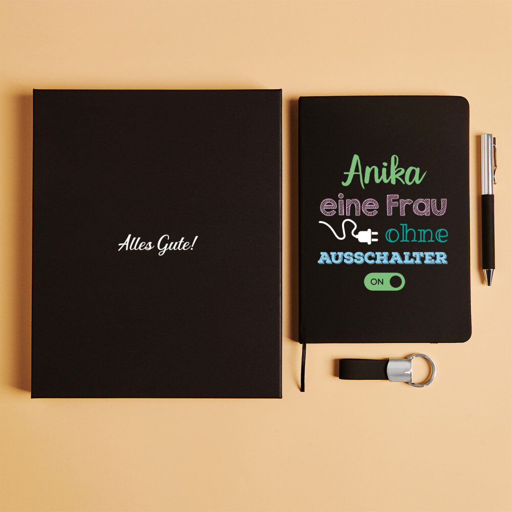 Set mit elegantem Notizbuch mit ausgewählter Personalisierung.
