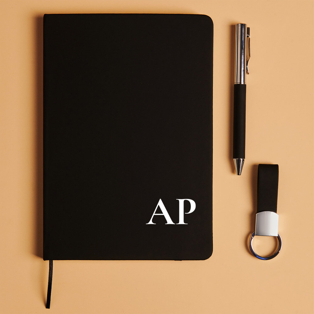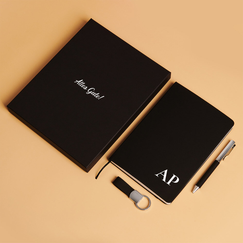 Set mit elegantem Notizbuch mit ausgewählter Personalisierung.