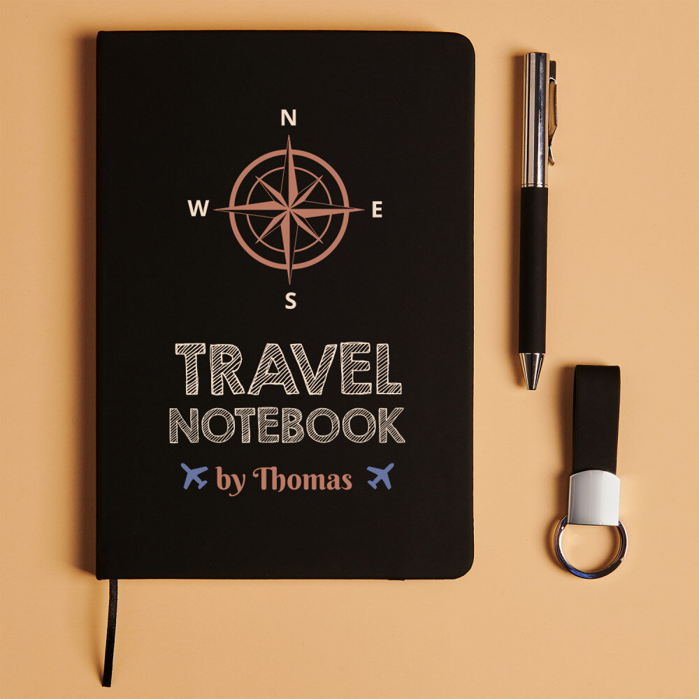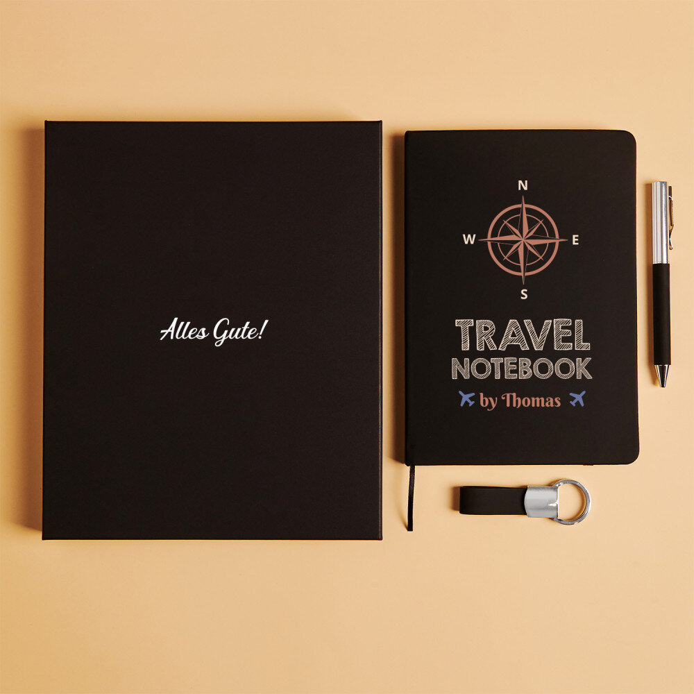 Set mit elegantem Notizbuch mit ausgewählter Personalisierung.