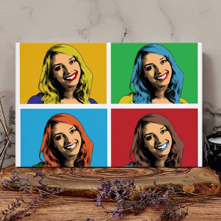 Das Porträt im Warhol-Stil stellt die berühmte Verbindung eines Fotos in unterschiedlichen farblichen Einstellungen dar. Ihr Foto gewinnt einen neuen, starken und einzigartigen Charakter.