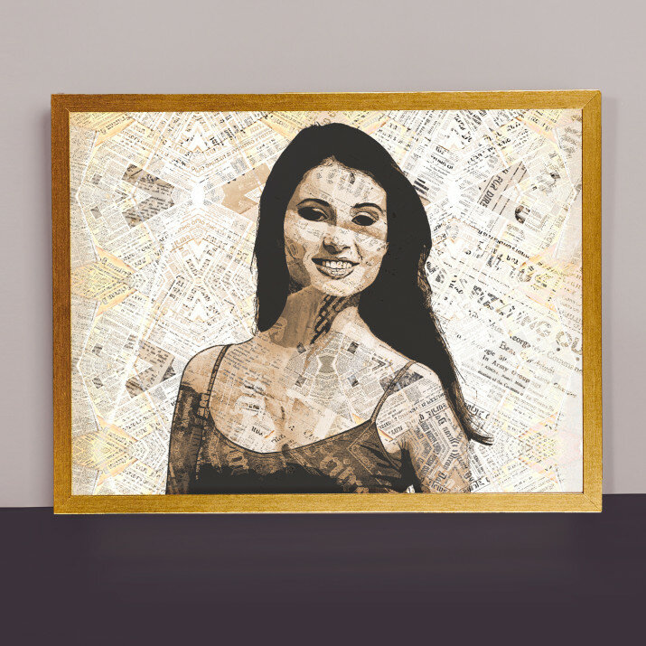 Newspaper Pop Art sind zusammengesetzte Zeitungsausschnitte, die das Muster bilden. Die Gestalt sieht so aus, als wäre sie mit starken Ölfarben gemalt worden.STILVOLLES LEINWANDBILD