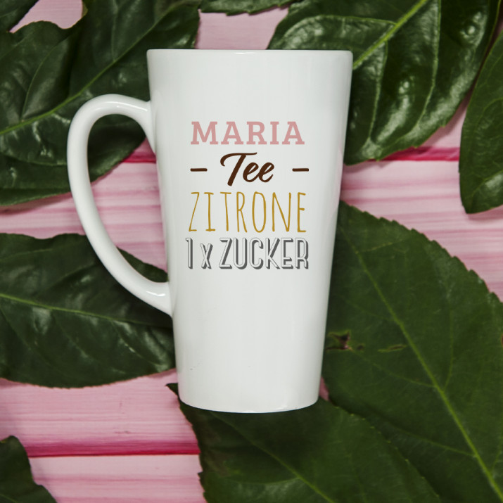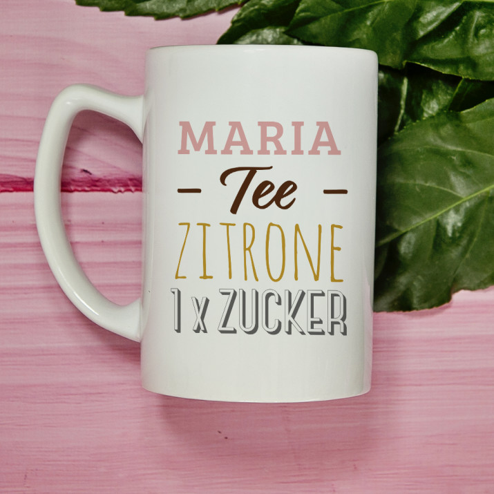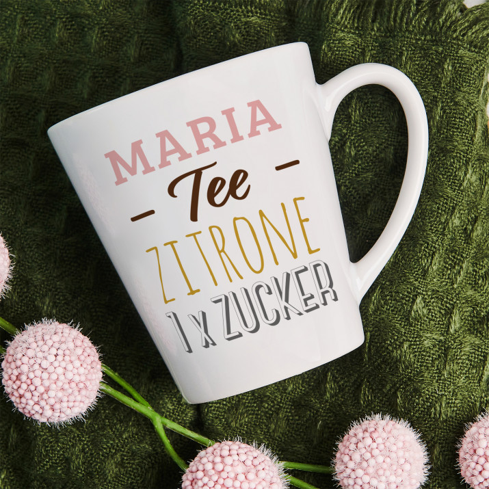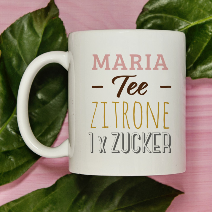 Geschenk für die Frau. Schenken Sie ihrer Freundin unsere lustige personalisierte Tasse: Tee, Zitrone, Zucker. Von heute an werden alle wissen, was Ihre Freundin am liebsten mag!