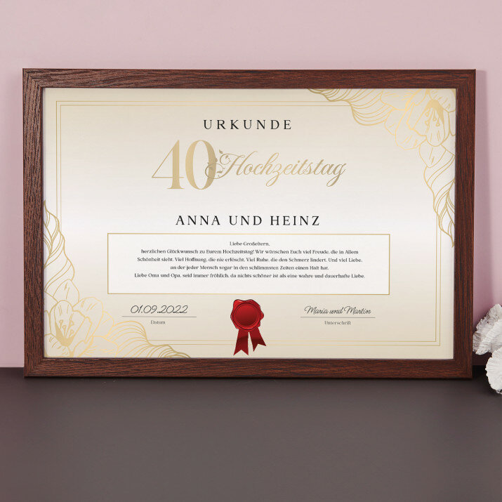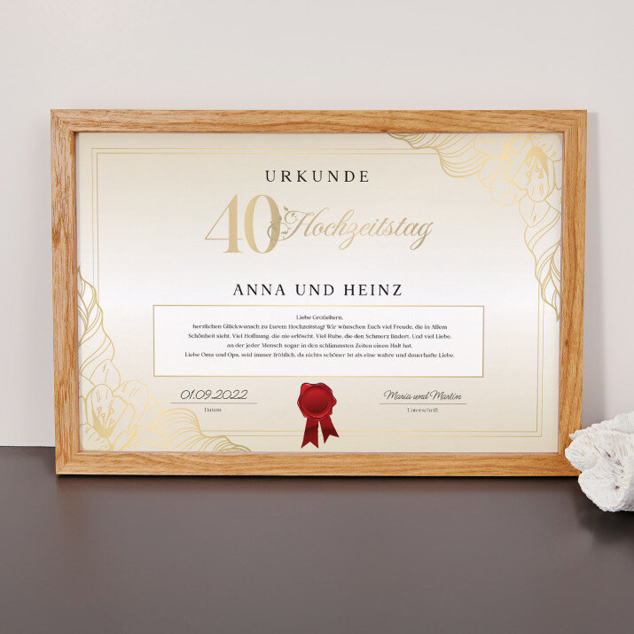 - Die Urkunde wird auf Fotopapier im Format 20x30 cm gedruckt und in einen eleganten Rahmen im Format 20x30cm gefasst.