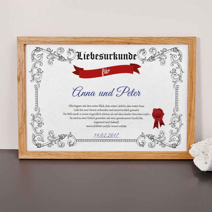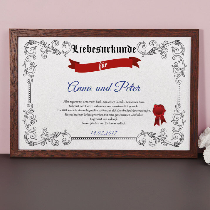Die Urkunde wird auf Fotopapier im Format 20x30 cm gedruckt und in einen eleganten Rahmen im Format 20x30cm gefasst.
