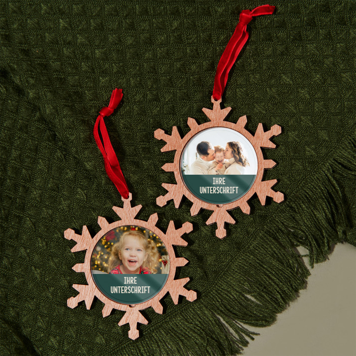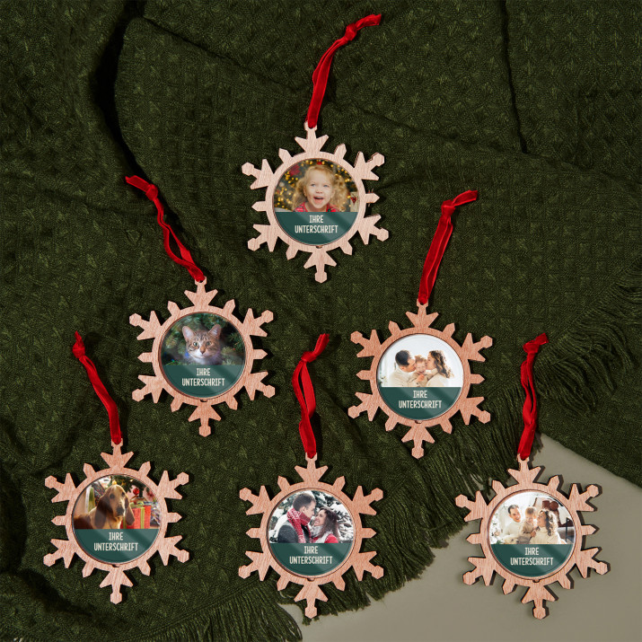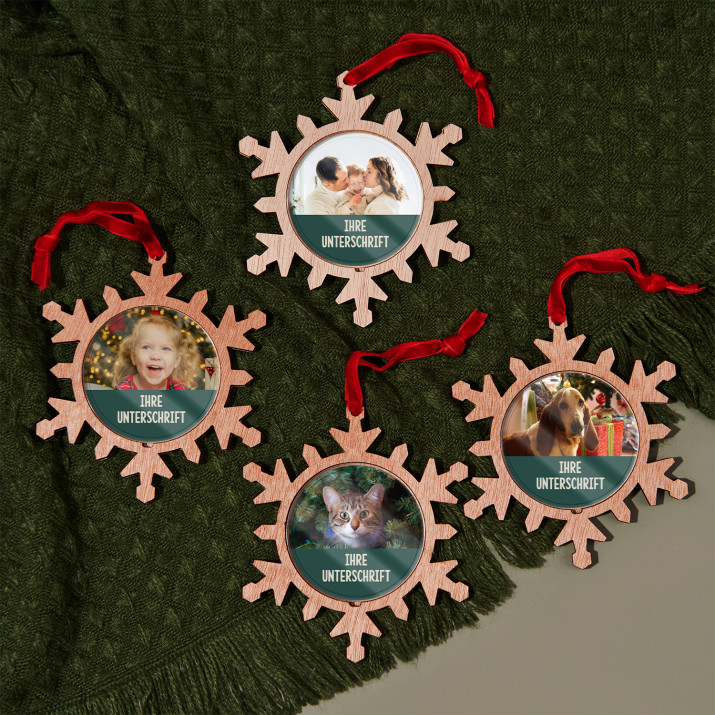 Spüren Sie den Zauber von Weihnachten und hängen Sie ein einzigartiges Foto an Ihrem Baum! Der Schneeflocken-Anhänger ist eine originelle Idee für die Dekoration eines Weihnachtsbaums. Umgeben von Kugeln und Ketten wird es wunderschön aussehen. Sie können einen geliebten Menschen überraschen und ihm ein solches Holzornament zum Weihnachtsfest schenken. Der Anhänger ist in vier Varianten erhältlich: 1, 2, 4 oder 6 Stück.Ausführliche Informationen: