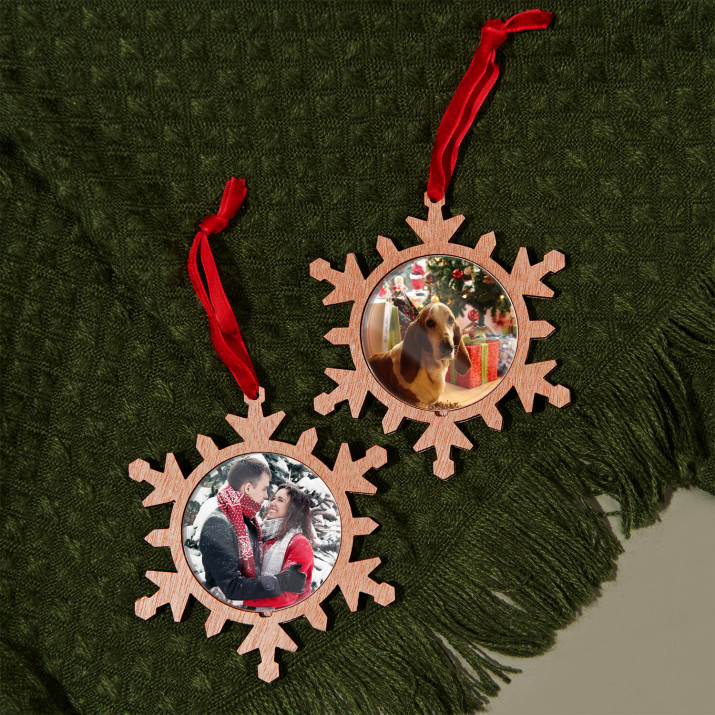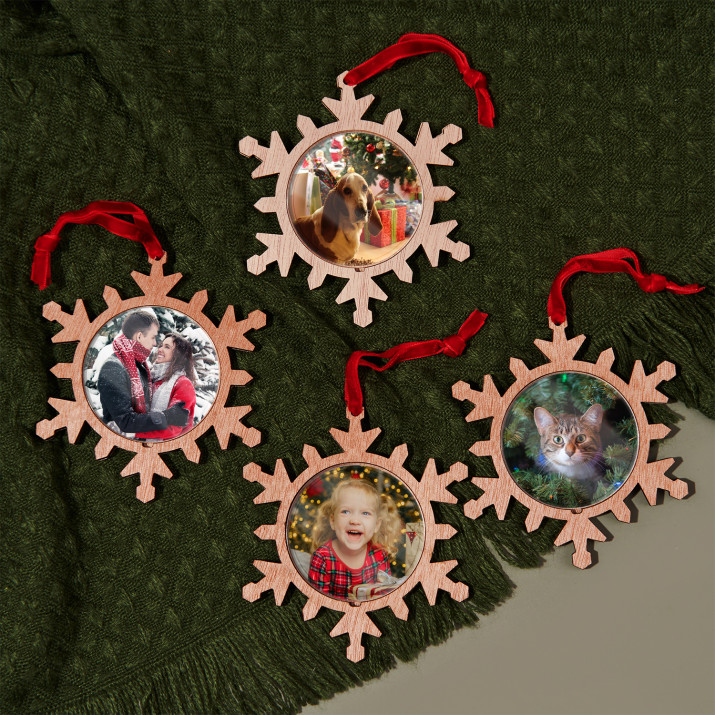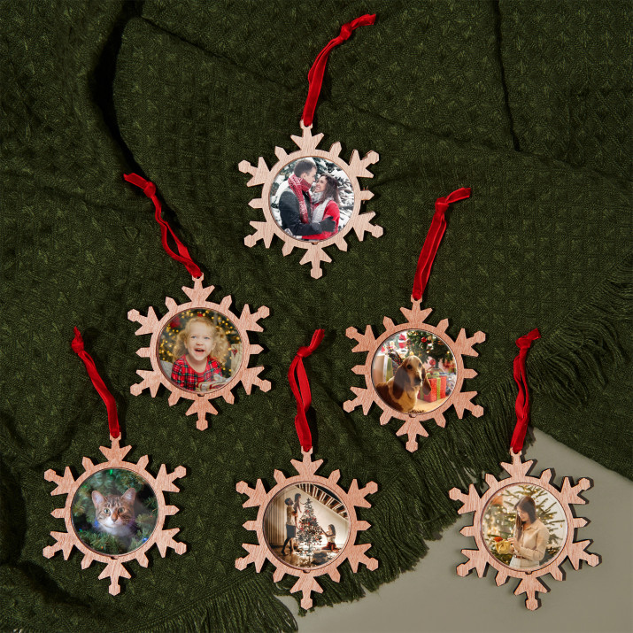 Spüren Sie den Zauber von Weihnachten und hängen Sie ein einzigartiges Foto an Ihrem Baum! Der Schneeflocken-Anhänger ist eine originelle Idee für die Dekoration eines Weihnachtsbaums. Umgeben von Kugeln und Ketten wird es wunderschön aussehen. Sie können einen geliebten Menschen überraschen und ihm ein solches Holzornament zum Weihnachtsfest schenken. Der Anhänger ist in vier Varianten erhältlich: 1, 2, 4 oder 6 Stück.Ausführliche Informationen: