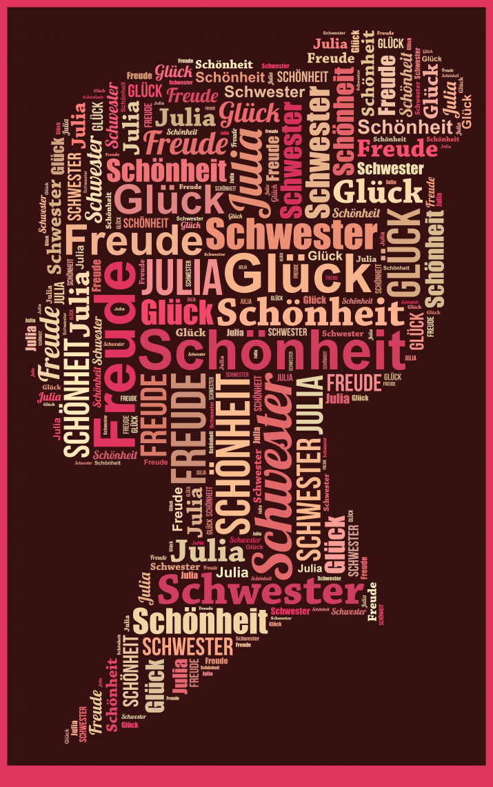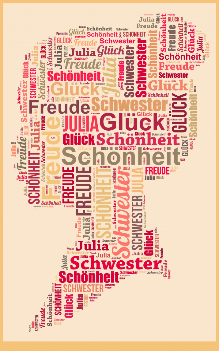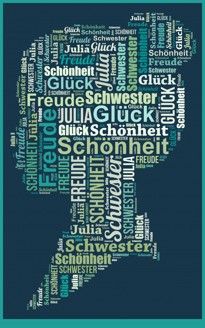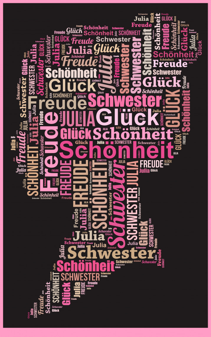 Das Wortbild ist ein außergewöhnliches Leinwandbild aus Ihren Worten. Sie können damit einer Ihnen nahestehenden Person Wünsche oder eine romantische Nachricht auf eine originelle Weise übermitteln. Indem Sie das Bild personalisieren, schaffen Sie ein einzigartiges Geschenk.Personalisierung