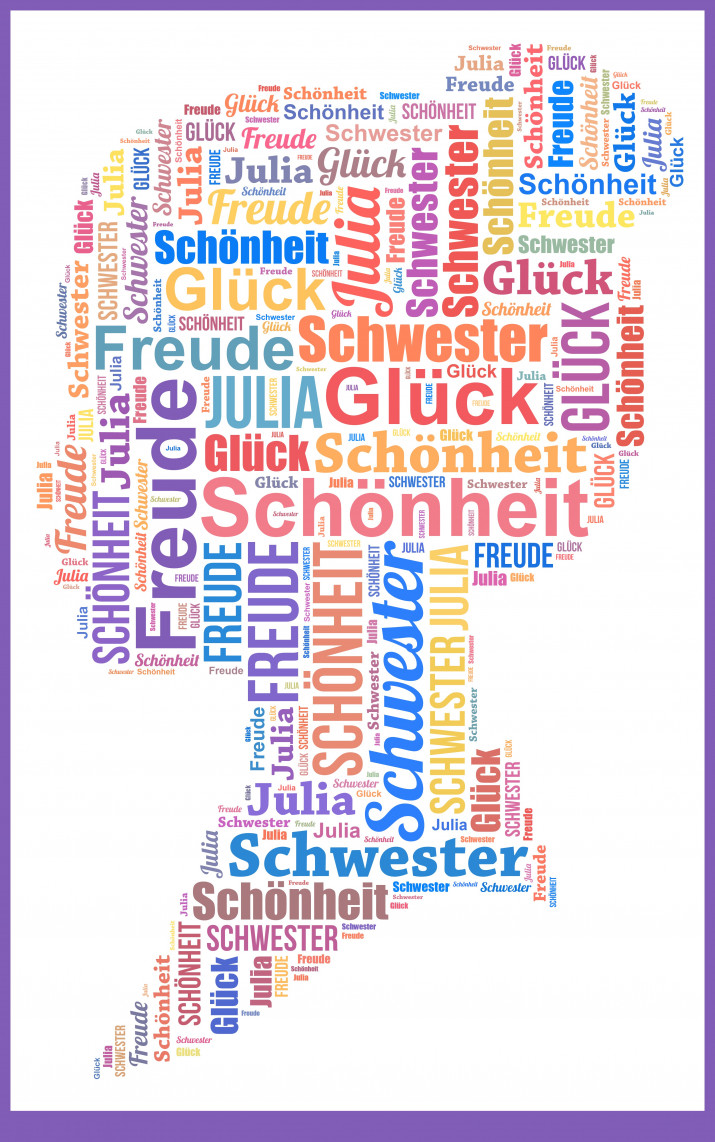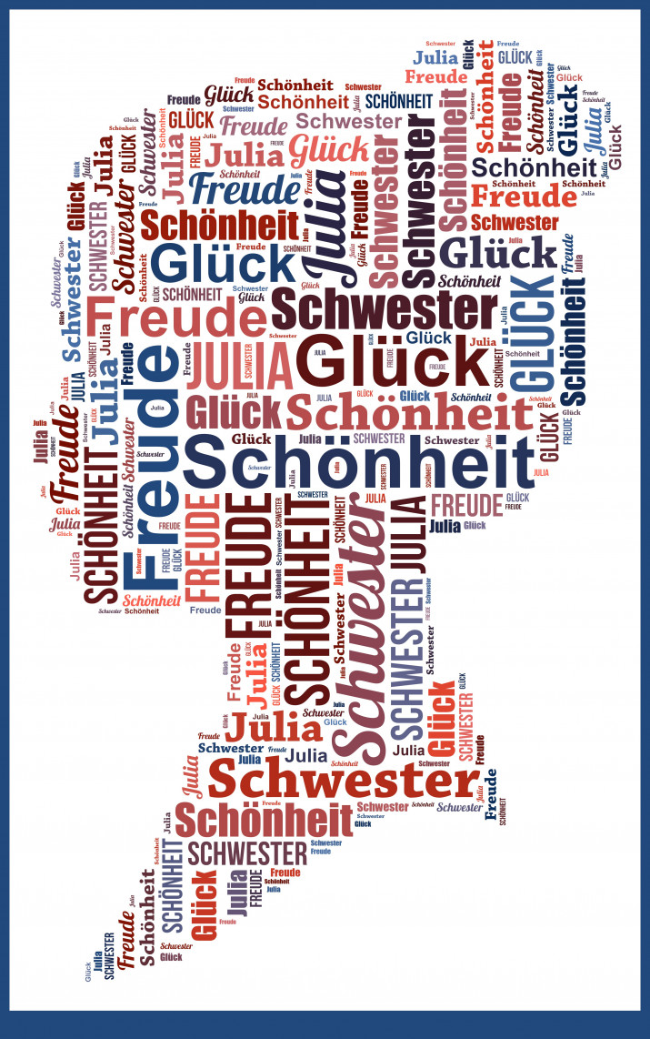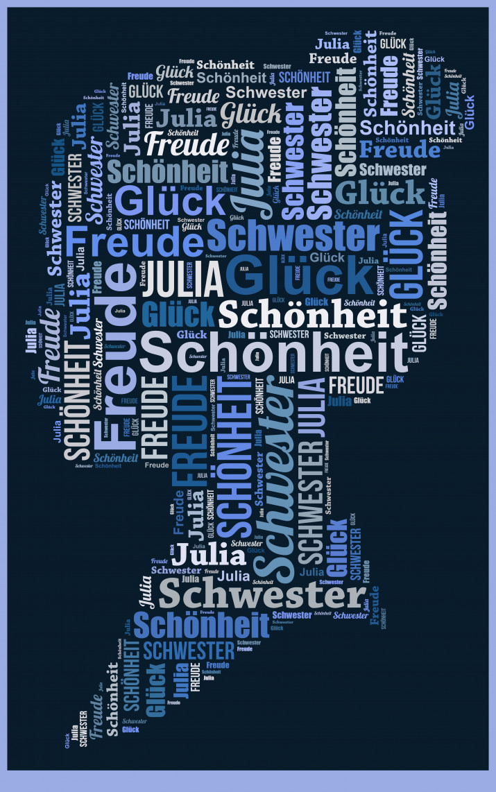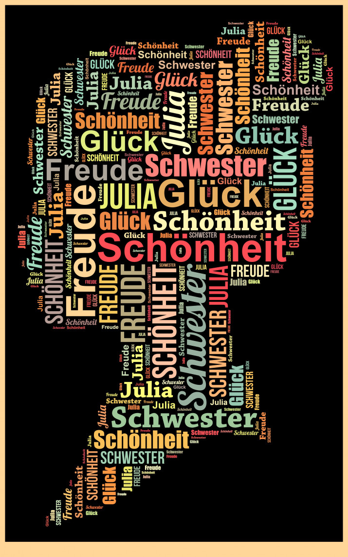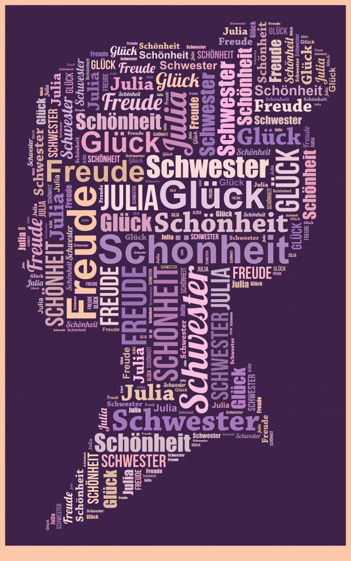 Das Wortbild ist ein außergewöhnliches Leinwandbild aus Ihren Worten. Sie können damit einer Ihnen nahestehenden Person Wünsche oder eine romantische Nachricht auf eine originelle Weise übermitteln. Indem Sie das Bild personalisieren, schaffen Sie ein einzigartiges Geschenk.Personalisierung