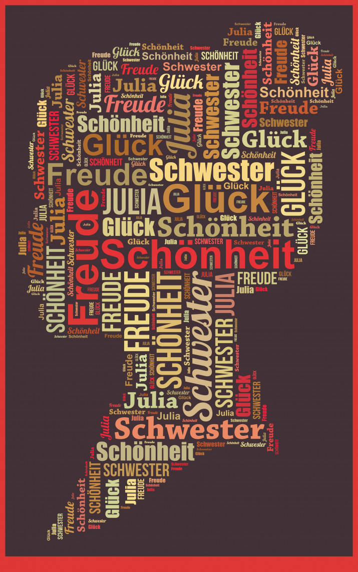 Die Personalisierung dauert nur ein paar Minuten. Alles, was Sie tun müssen, ist Worte, aus denen sich das Motiv zusammensetzen wird, und eine von 10 verschiedenen Farbversionen zu wählen.Anfertigung