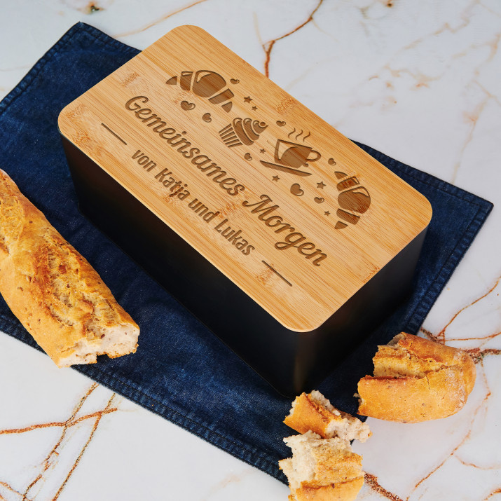 Rechteckiger Brotkasten aus Aluminium mit Bambusdeckel, der gleichzeitig als Schneidebrett dienen kann. Der ästhetische und haltbare Deckel ermöglicht ein bequemes Schneiden, und der längliche Brotkasten ermöglicht die sichere Aufbewahrung verschiedener Brotsorten . Die universelle schwarze Farbe des Brotkastens passt zu jeder Küche und wird den Empfänger sicherlich ansprechen. Auf dem Deckel befindet sich eine personalisierte Gravur.