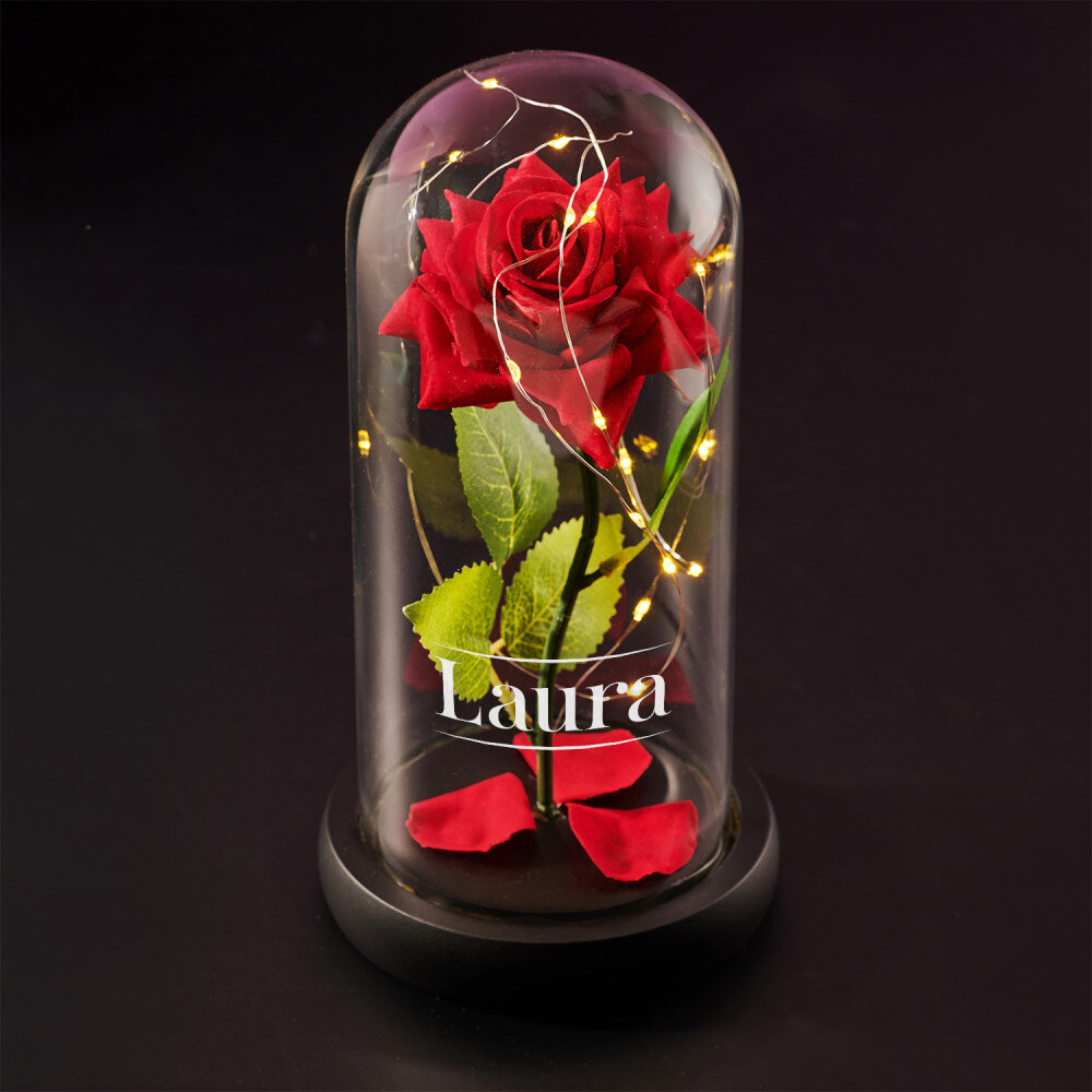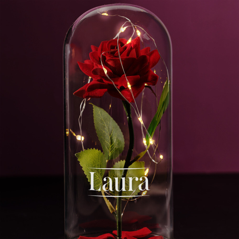Außerdem schaffen die LED-Leuchten im Inneren eine romantische Atmosphäre. Die Oberfläche der Glaskuppel kann zusätzlich mit Initialen, Namen oder einer kurzen Nachricht Ihrer Wahl eingraviert werden, was das Geschenk noch spezieller macht. Die ewige Rose wird in einer Geschenkbox geliefert.