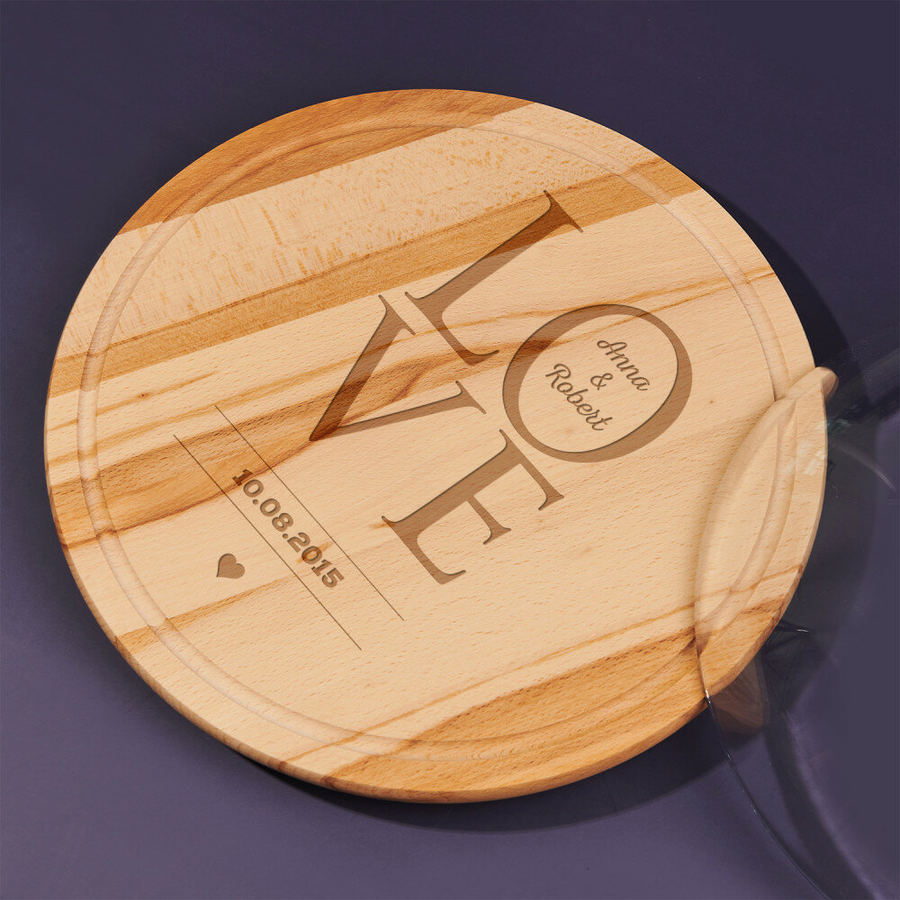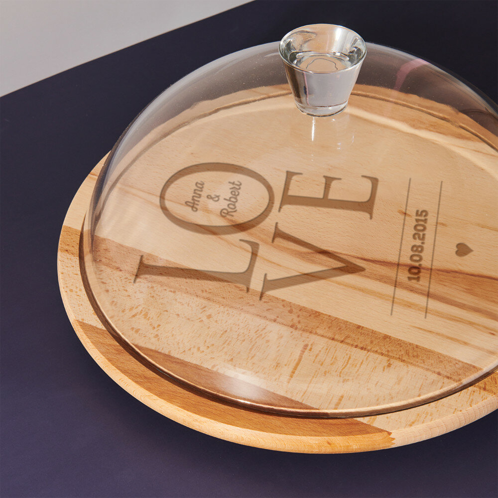 Das runde Schneidebrett besteht aus Buchenholz, wodurch es elegant aussieht und in jede Küche passt. Die hochwertige Glasglocke verleiht dem Produkt eine Verfeinerung, und das Ganze ist eine sehr praktische und effektive Ergänzung für die Küche. Das Brett zeichnet sich durch eine solide Verarbeitung aus, ist widerstandsfähig gegen Beschädigungen und mit einer personalisierten Gravur verziert. Mit einem solchen universellen Produkt können Sie verschiedene Köstlichkeiten wie Obst oder Kuchen aufbewahren und servieren.