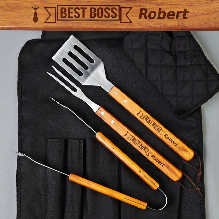Das Grillset aus Metall und Holz. Im Set gibt es auch einen Küchenhandschuh und eine Grillschürze, die auch als Etui für das Grillbesteck dient. Dank der besonderen Gravur wird das Grillbesteck zu einem einzigartigen Geschenk!
