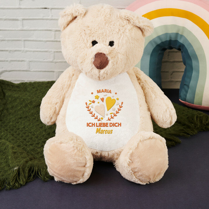Die Personalisierung dauert nur einen Augenblick. Füllen Sie die Felder in der Sektion "Personalisierung" aus und klicken Sie "In den Warenkorb" - wir schaffen Ihren einzigartigen Teddybär für Sie.