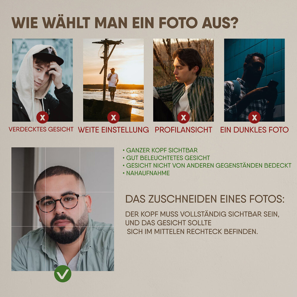 Die Personalisierung eines Bildes ist ganz einfach: Sie schicken uns Fotos, die Sie mit Ihrer Kamera oder Ihrem Handy aufgenommen oder von Facebook heruntergeladen haben. Nach Erhalt Ihrer Bestellung kümmert sich unser talentierter Grafikdesigner um die Erstellung Ihres Porträts!